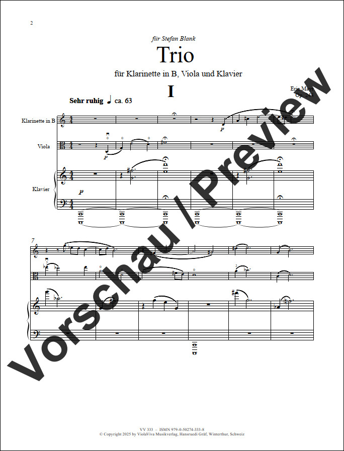 Das Trio für Klarinette, Viola und Klavier ist Teil von ViolaVivas wachsendem Katalog an Unterrichtsliteratur für Viola, das in drei Reihen angelegt ist: First Steps, Moving Up und Mastery. Für die genaue Bezeichnung der Viola-Stimme mit Bogenstrichen und Fingersätzen danke ich Monika Zimmermann herzlich. Nicht zuletzt danke ich Austin Boothroyd für die Betreuung dieser Ausgabe und Hansruedi Gräf für die freundliche Zusammenarbeit!